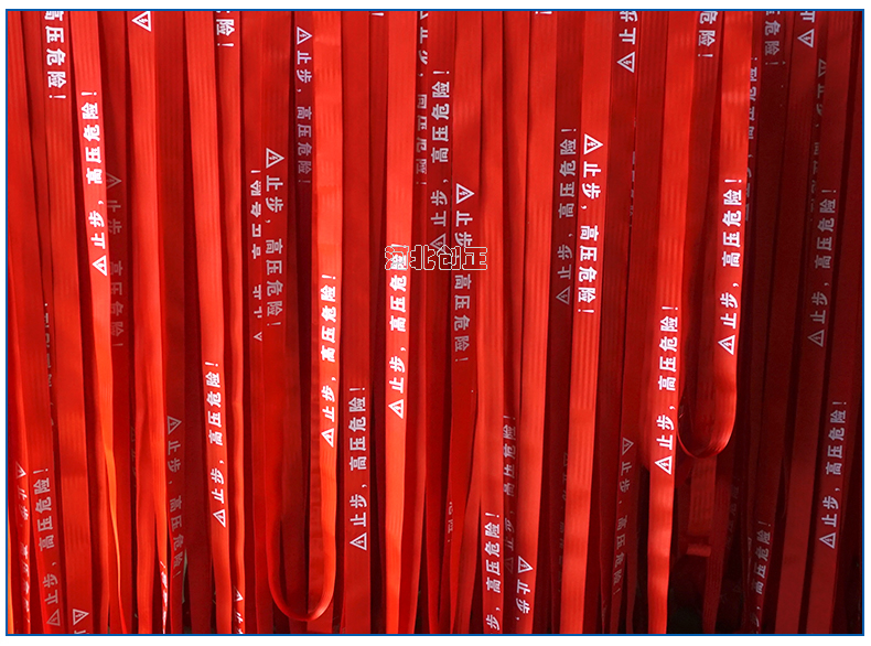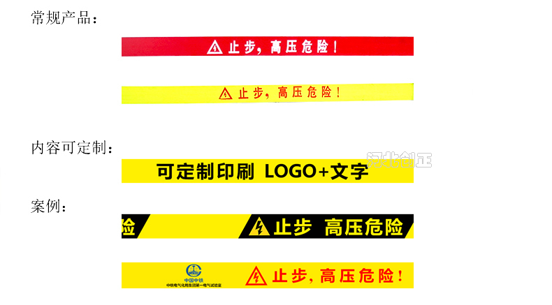 警示帶盒是ABS材料制成;帶是錦綸材質(zhì),上面印有“閃電符號,止步,高壓危險(xiǎn)”等字樣。