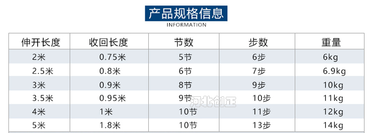 伸態(tài)5.0m, 縮態(tài)1.20m, 10節(jié), 13步;