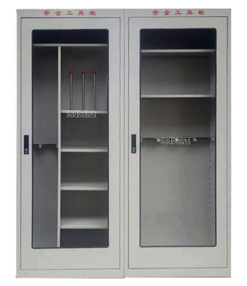 1、柜體是冷軋鋼板卷壓成型,厚度有1.0mm,1.2mm,1.5mm供選擇。柜體表面采用靜電防腐噴塑工藝,顏色為駝灰色,柜門裝有通體透明鋼化玻璃,透過玻璃可以看到分類有序的工器具。