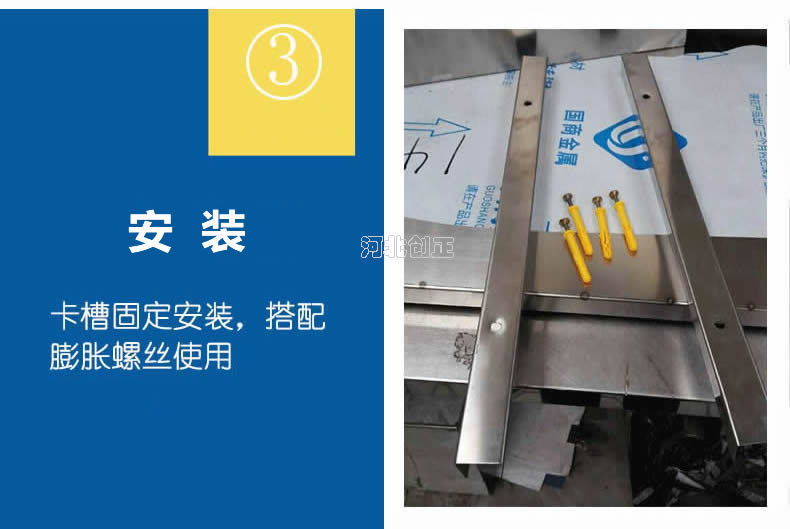 不銹鋼擋鼠板安裝簡(jiǎn)單,先將膨脹螺釘(內(nèi)膨脹也叫漲塞)穿入卡槽上的安裝孔,再將兩側(cè)的卡槽沿門(mén)框?qū)⑴蛎浡葆斊叫泄潭ǖ介T(mén)框兩邊墻體上,卡槽安裝成功。使用時(shí)把擋鼠板順卡槽的內(nèi)徑滑入卡槽之中。不用時(shí)將擋鼠板取出,固定在墻體上的卡槽不影響門(mén)的正常開(kāi)關(guān),不用取下。