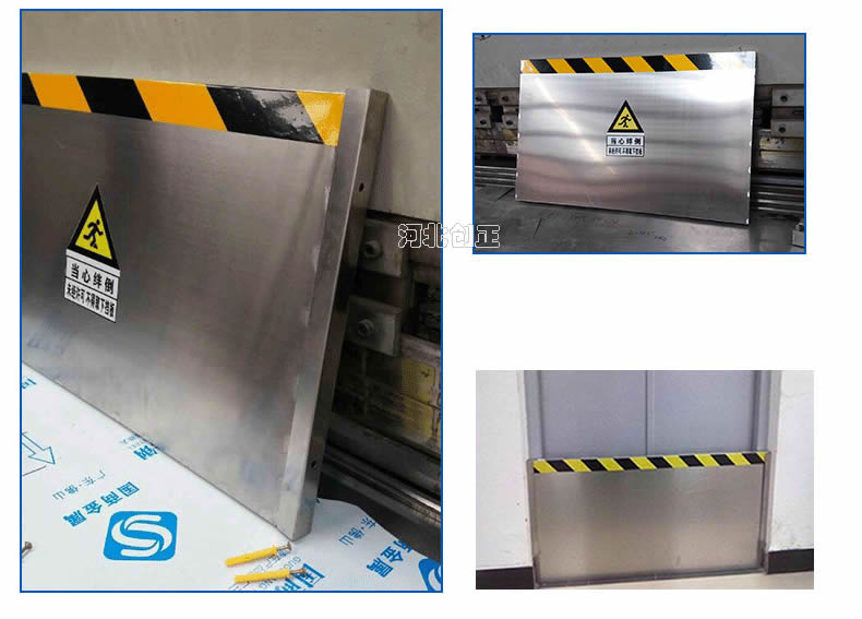 不銹鋼擋鼠板表面經(jīng)防腐處理。擋板上部貼有黃黑相間的反光條,起到警示作用。