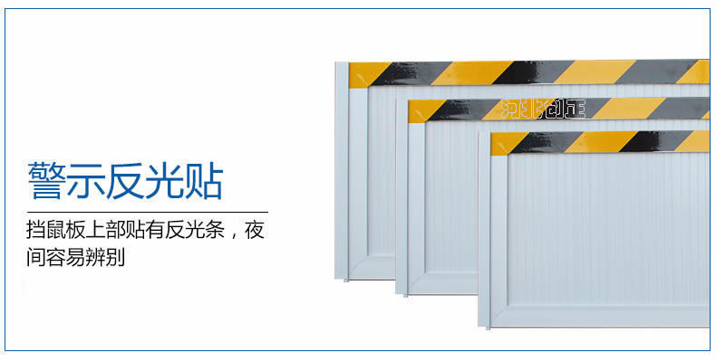 鋁合金擋鼠板采用鋁合金板材制做。擋鼠板上部貼黃黑相間反光條,反光條為反光膜加背膠紙制作。